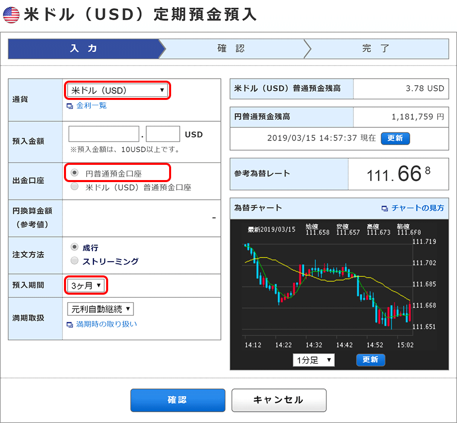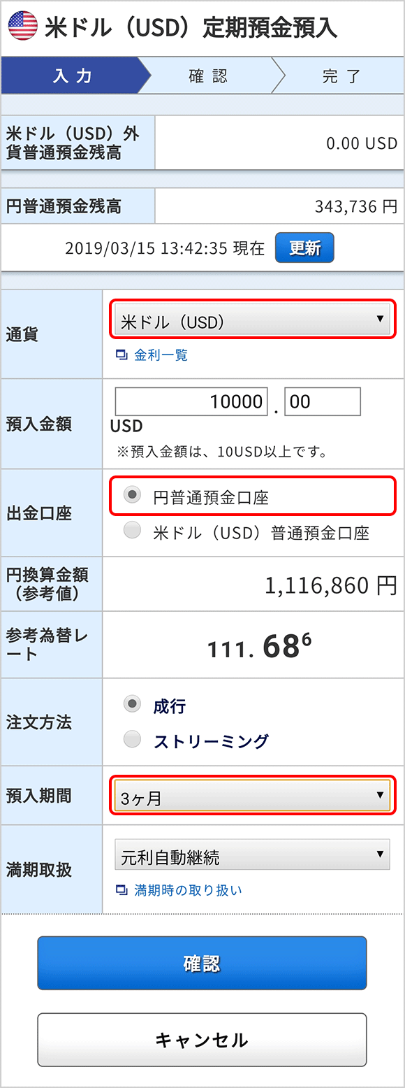 外貨預金取引へログインし、米ドル(USD)定期預金預入画面にて、下記のように、出金口座は「円普通預金口座」、預入期間は「3ヶ月もの」を選択してください。
