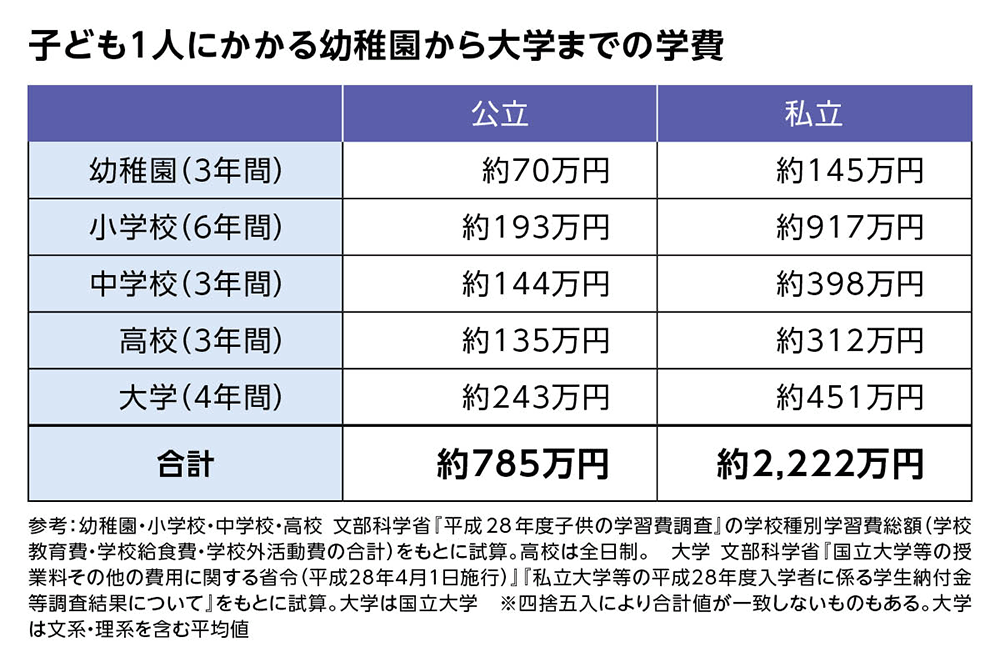 お子さんのいる30〜40代の人の資産運用例として、教育費作りを取り上げてみます。教育費は、公立か私立か、大学までいくか、理系か文系か、自宅通学か、留学もあるかなどの進路選択によって大きく変わってきます(詳しくは以下を参考に)。