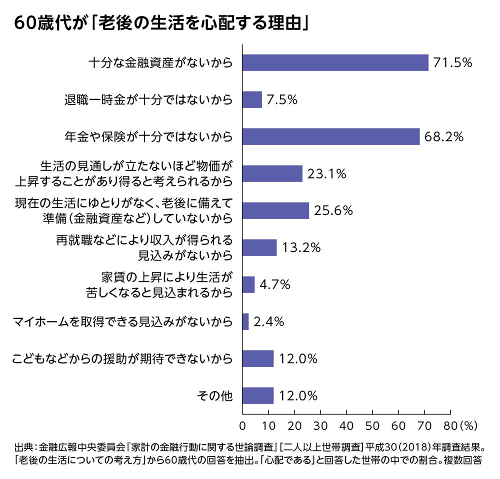 退職後は年金を頼りに、足りない分は貯蓄を取り崩して慎ましく暮らす……というのが、これまでの60代の生活イメージでした。しかし、もはや退職金も年金もあまり当てにならない時代。金融広報中央委員会の調査でも、60代が「老後の生活を心配する理由」として「十分な金融資産がないから」71.5%、「年金や保険が十分ではないから」68.2%、「現在の生活にゆとりがなく、老後に備えて準備(金融資産など)していないから」25.6%などが上位で、「老後は自分たちで何とかする」という覚悟が必要になっています。